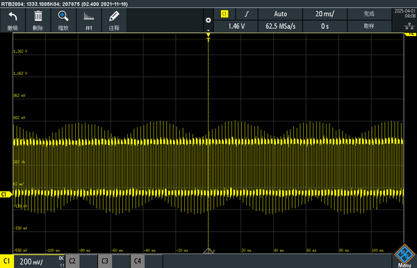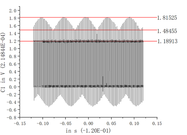 In this experiment, AC and DC values were obtained through the following procedure. The waveform image captured from the oscilloscope was imported into Origin for reconstruction. Straight-line fitting was applied to approximate the signal's peaks, troughs, and baseline, allowing for the extraction of average values. The DC component corresponds to the baseline level of the signal, represented by the lowest line in the figure, with a measured value of 1.18913. The AC component is defined as the difference between the peak and the baseline; in this case, it is the difference between the highest line at 1.81525 and the middle line at 1.48455.