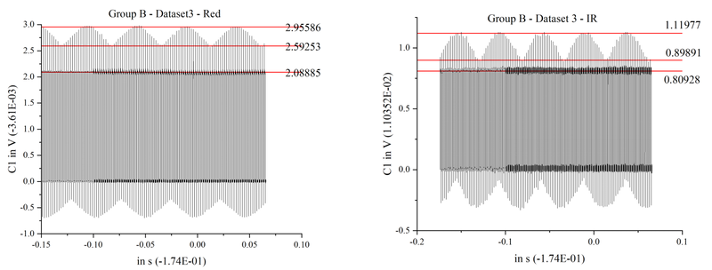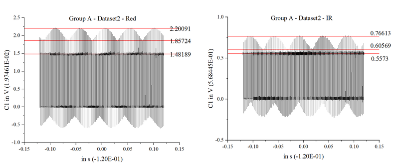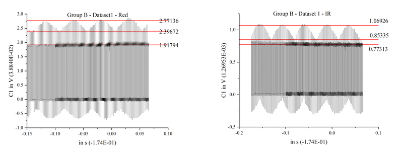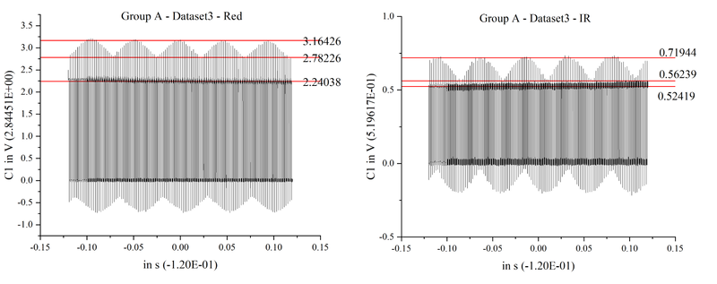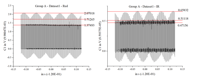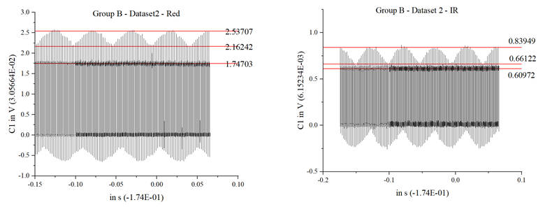 Blood oxygen levels were measured from two individuals, each with three trials. Oscilloscope waveforms were imported into Origin to calculate R values, which were then used to compute SpO₂. After calculating the variance, poor-quality data were excluded to improve accuracy. The remaining values were then averaged to obtain reliable results. The results were compared with readings from a fingertip pulse oximeter.