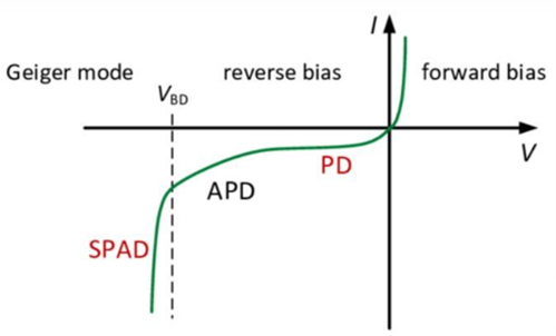 3. Beyond the breakdown voltage (VBD), the LED operates in Single Photon Avalanche Diode (SPAD) mode, even a single photon can trigger avalanche impact ionization, creating a macroscopic current pulse. SPAD mode have infinitely effective gain, however, the detectable gain is limited by noise, electric loss and quenching.