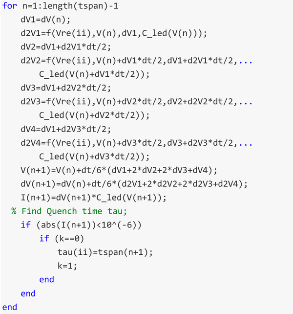 Since the capacitance is a non-linear function of V_LED, it is extremely difficult to solve the circuit equation directly; instead, translating the equation into numerical calculation programme in MATLAB makes it easier to visualize the theoretical calculation result, which is relatively close to experimental results: