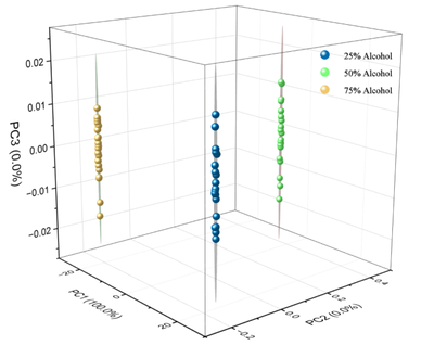 - Use Origin software for spectral normalization and baseline correction, and process the alcohol spectra at three different concentrations.(Due to the subtle differences in the spectral data, it is difficult for non-experts to visually distinguish between the spectra of the three alcohol concentrations. Therefore, machine learning-based Principal Component Analysis (PCA) is applied for spectral classification, enabling accurate measurement of alcohol concentration.)