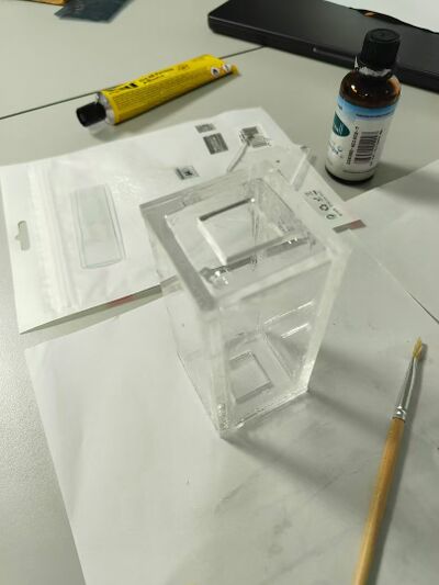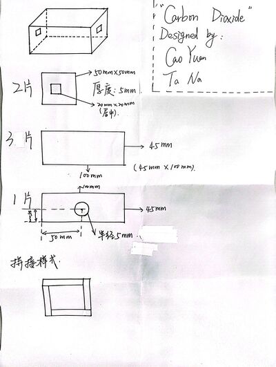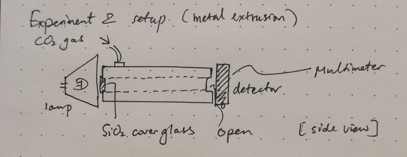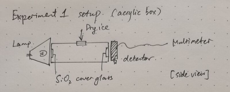 For the first experiment, an acrylic gas chamber was designed as in Figure 2. On either side, a piece of 2 μm thick cover glass was sealed to allow light transmittance and avoid gas leakage. A window is left on top to allow the injection of CO2 or dry ice. After injection, the window will be manually sealed. The center of the lamp, gas chamber and detector are aligned on the same horizontal line. Once fixed, they are not moved around for the day during experiments.