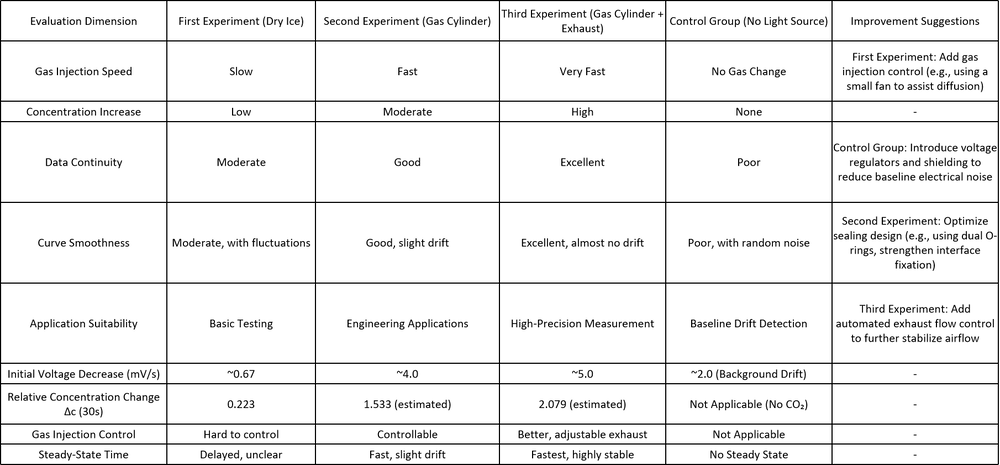 The third experimental setup proves to be the most effective in achieving high data precision, stability, and time resolution, making it the best choice for real-time CO₂ concentration monitoring. Future improvements should focus on enhancing the system's electrical stability, automating data acquisition, and improving flow control mechanisms for even greater experimental accuracy.