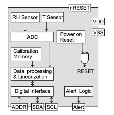 • Humidity sensing element: This is a capacitive humidity sensor that detects moisture content in the air. It measures changes in capacitance caused by water vapor.