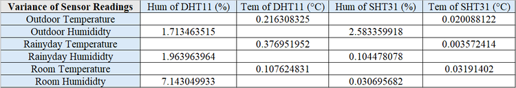 To assess the consistency and performance of the two sensors (SWT Sensor 1 and DHT11 Sensor 2), we calculated the sample variance for each set of measurements across different environments: rainy conditions, indoor room, and canteen. The variance provides a quantitative measure of the spread or variability in sensor readings.
