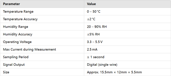 • Temperature sensing element: The temperature is measured using an integrated thermistor. The resistance of the thermistor changes with temperature, and the onboard microcontroller converts this change into a temperature value.