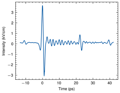 3. The time-domain shape of the pulse presents a manifest chirp. Since a common Terahertz wave generated by LN crystal should have no oscillation "tails" after the main peak. This chirp should be interpreted as a consequence of the high humidity in the lab. Similar phenomena are observed in other research. [4]