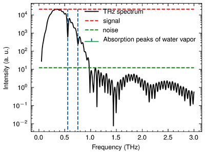 1. Since the humidity in the lab was about 50% to 60%, the Terahertz wave should perform absorption peaks. The peaks in the spectrum well aligns with the water vapour absorption peaks at 0.557 THz and 0.753 THz. [2] Thus, we are sure that it should be a THz wave.