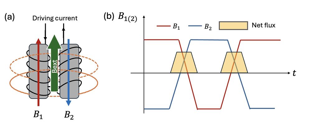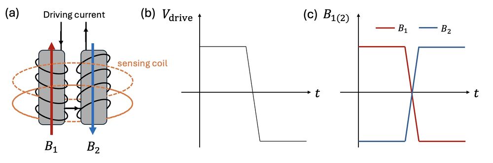 Let us go through the main features of a fluxgate. As shown in Figure 1, the core of a typical fluxgate magnetometer consists of two identical ferromagnetic rods with magnetic permeability , each wrapped with a coil through which an alternating driving current flows in opposite directions. This setup generates magnetic fields and that are also in opposite directions, where and are auxiliary magnetic field generated by the coils. These coils are driven by a time-varying current (Figure 1b), typically a square wave. A secondary (sensing) coil is placed around both of the two cores to detect changes in net magnetic flux. In the absence of an external magnetic field, the opposing magnetizations and cancel out exactly, resulting in zero net magnetic flux through the sensing coil. Therefore, no voltage is induced in the sensing coil.