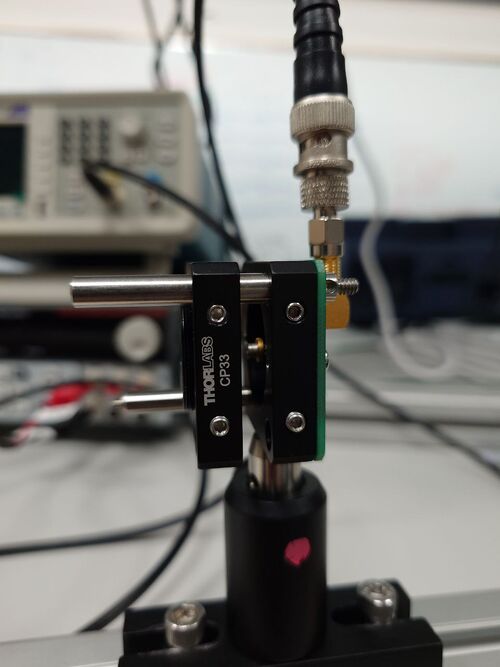 1. One of the challenges we faced was centring the beam onto the photodetector. Due to the lack of a focusing beam on the photodetector, the laser beam spot size was much larger than the surface area of the photodetector. What this led to was a constant fluctuation of the delay time on the oscilloscope as the brightest part of the beam was not always centred on the photodetector despite optimising stabilisation of the beam path.