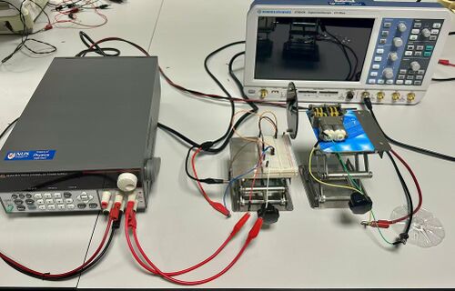 To ensure both mechanical stability and reliable electrical measurement, a rigid circular disk with uniform thickness was mounted on the motor shaft to maintain rotational balance and minimize wobble, then rotated by motor for continuous motion. To improve the mechanical coupling, a central hole was drilled in the disk by soldering machine and subsequently adjusted using a heat gun to achieve a closer fit to the shaft. Two magnets with opposite magnetic directions were attached to the disk, while the Hall sensor was positioned adjacent to the rotating path so that the changing magnetic field could be detected during rotation. The motor and Hall sensor were powered by an external supply, and the Hall sensor was connected on a breadboard for circuit integration. Finally, the sensor output was connected to the oscilloscope, where the resulting digital waveform could be observed. The actual experimental setups is shown below in Fig. 3.