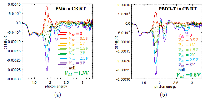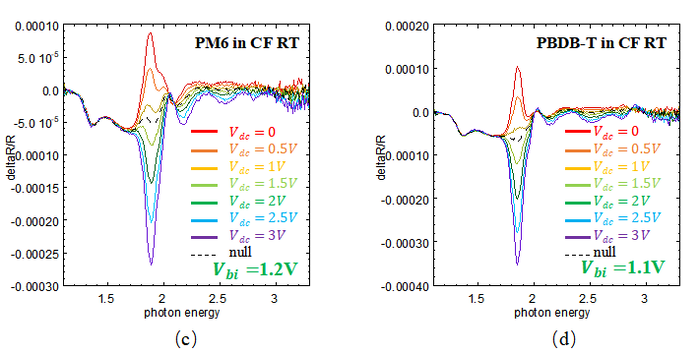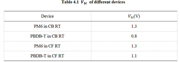 Because the above conclusion was reached under the assumption that different devices have the same film thickness and built-in potential, it may be inaccurate if the actual device thickness or built-in potential varies. Therefore, electro absorption(EA) spectroscopy is required to determine of each device, so that carrier mobility can be quantified using the Mott-Gurney law.