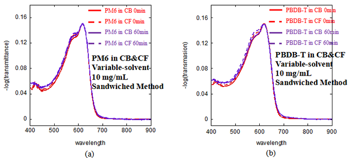 For both polymers, the difference between the two characteristic peaks is larger in CB than in CF. This suggests that the polymer chains show a stronger aggregation tendency in CB under the same conditions. The same trend is observed for both PM6 and PBDB-T, indicating that CB leads to a higher degree of solution-state aggregation than CF in these two polymer systems. In addition, no clear change is observed between the spectrums recorded at 0 min and 60 min for any of the four solutions. This indicates that all four solutions remain stable over the measured time range, and their aggregation states do not change significantly with time.