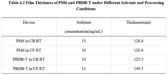 As shown in Fig. 4.2, at the same temperature, the mobility of PM6 films processed from CB is higher than that of films processed from CF, while the opposite trend is observed for PBDB-T. These results indicate that solvent processing conditions can significantly influence the carrier mobility of the films.