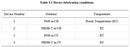 During the fabrication of the organic semiconductor active layer, OSC films were spin-coated onto ITO/pTFF substrates under different conditions. In total, 11 groups of devices were fabricated, as summarized in the table below. The thickness of the OSC films was approximately 120 nm. Finally, Ag was deposited as the cathode by thermal evaporation to complete the device fabrication. | |||