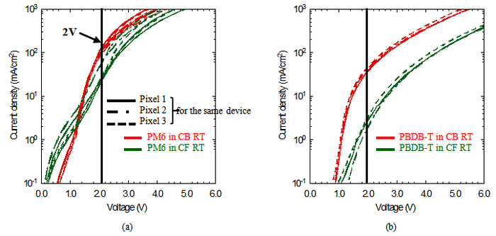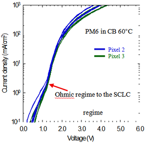 <center> Fig 1.4. Current density–voltage (J–V) curves of PM6 in CB at 60 °C, where different colors represent different pixels of the same device; the kink in the curves indicates the transition from ohmic contact to space-charge-limited current (SCLC) conduction. </center> | |||