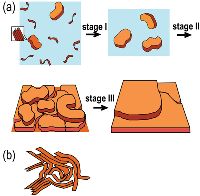 <center> Fig 1.5. (a) Schematic of the dilute π-stacking mechanism that leads to formation of unentangled π-stacked extended-chain lamellae that give rise to the monolayer-terraced film morphology. This mechanism can be induced by a borderline solvent or in very dilute solutions of a good solvent. (b) Schematic illustration of the morphology of a thick film deposited from a good solvent. </center> | |||