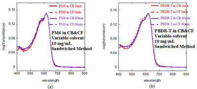 <center> Fig4.1 UV–Vis spectra of (a) PM6 in CB and PM6 in CF, (b) PBDB-T in CB and PBDB-T in CF, measured at a solution concentration of 10mg/mL using the sandwiched method. </center> | |||
